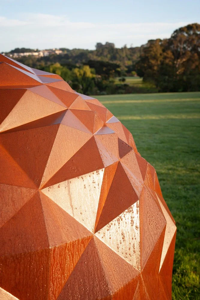 Greg Tuthill explores geometry in the plant world in his work Nonagon Acorn. He chose the acorn for its fascinating contrast in texture between the smooth nut and the textured cupule (the cup-like structure that supports the nut), and its mathematical form – the cupule follows a Fibonacci geometry. Using Corten steel for its organic look and feel, his abstracted nine-sided form approximated the cylindrical acorn, while still incorporating a deliberate golden ratio.