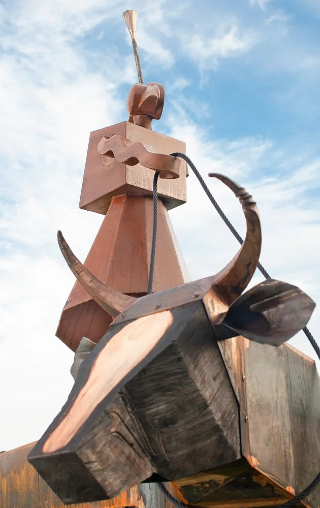 Jamie Pickernell, Moo, 2024, Corten steel, wood and stainless steel.