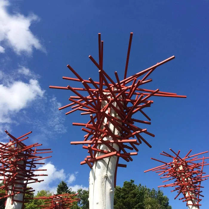 Containment and invasion are concepts that the gardener grapples with daily, and these are subtly alluded to in Louise Purvis’ galvanised steel Gravid which looped and curved over many metres. For John Edgar, it was always about the geology, and his basalt Font marked out Auckland’s volcanic foundations. Jim Wheeler’s Golden Bough harked back to traditional legends, adorning its upright support like a brooch, while Christine Massey honoured the nurturing of mothers with her bronze trinkets hung out to line-dry. In his installation, Anthony Cribb made reference to how we manipulate nature to human will. David Carson’s Splitting Head Ache used the trunk of a Robinia pseudoacacia to evoke a dendrological bad hair day. There was a conservation message in Graham Bennett’s denotation of impending environmental catastrophe in On Becoming Misdirected. Thousands of dog tags hung from a tree commemorate the New Zealand servicemen who served in the Vietnam War in Donna Sarten’s Strange Fruit (Revised).